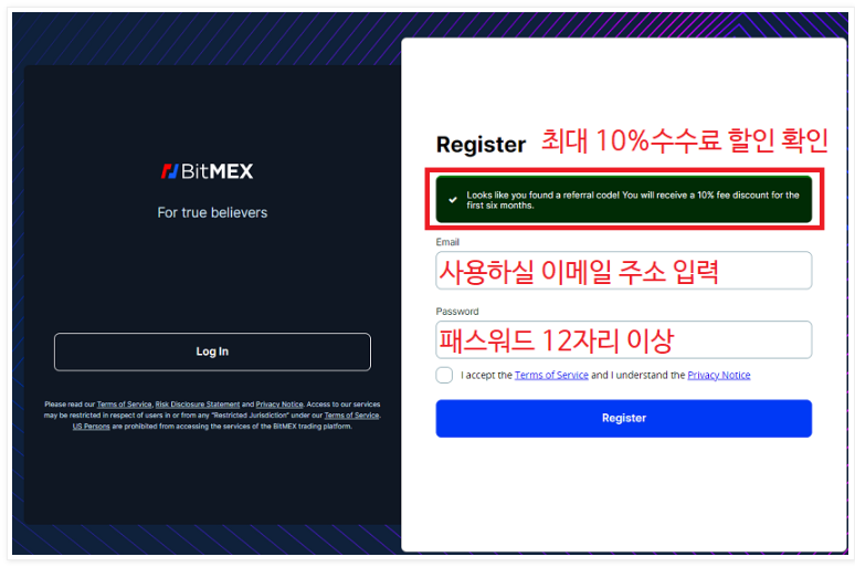 위 주소를 통해서 가입하셔야 Bitmex 거래 수수료 할인을 받으실수 있어요.